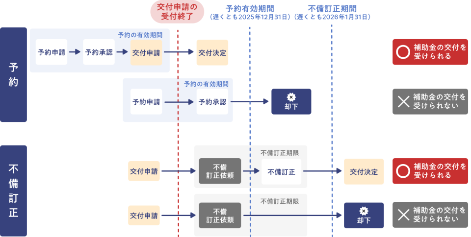 - 受付終了後に、予約の有効期間の超過、不備訂正期限の超過、その他の事由により、却下された交付申請(予約を含む)は、再提出ができないため、交付決定を受けることはできません。