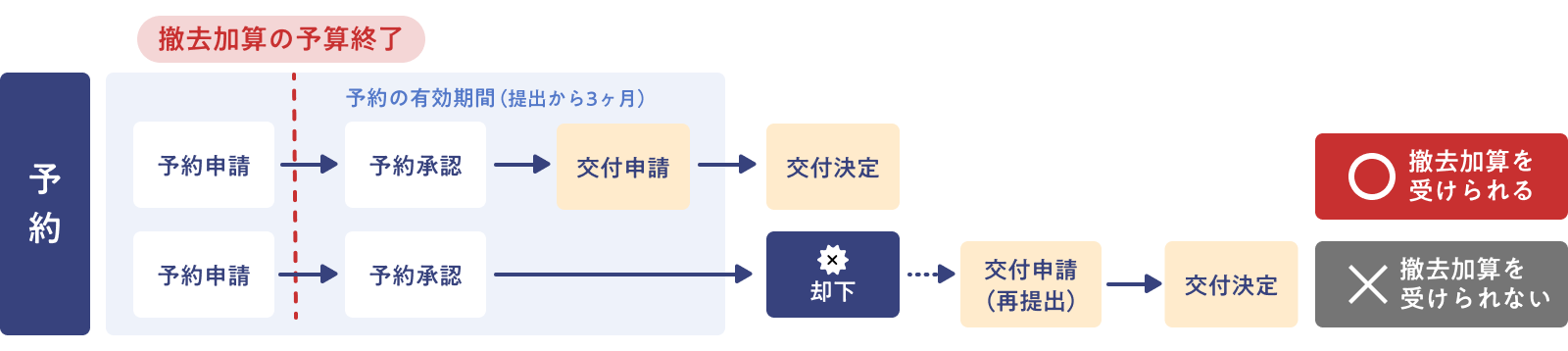 - 撤去加算を含む交付申請の予約をした事業者は、予約の有効期間内に交付申請の提出を行ってください。