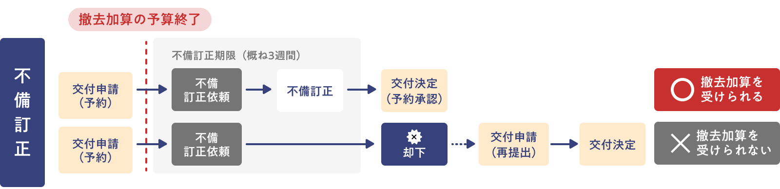 当該不備訂正期限までに再提出されない場合、当該交付申請(予約を含む)は却下されます。 - 撤去加算受付終了後に、予約の有効期間や不備訂正期限の超過、その他の事由により、却下された撤去加算を含む交付申請(予約を含む)は、 撤去加算を含む交付申請(予約を含む)の再提出ができないため、本加算措置を受けることはできません。
